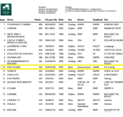 Am 31.03.2013 war Fidji Island Nr. 10 auf der FEI-Weltrangliste der Springpferde.